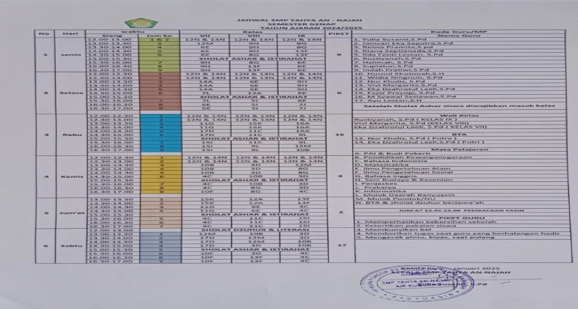 Jadwal Pelajaran Semester Genap Tahun Ajaran 2024/2025 di SMP Yahya An-Najah